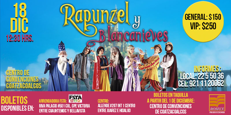 No te pierdas la puesta en escena Rapunzel y Blancanieves en el Centro de Convenciones Coatzacoalcos el 18 de Diciembre a las 12:30 hrs.